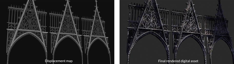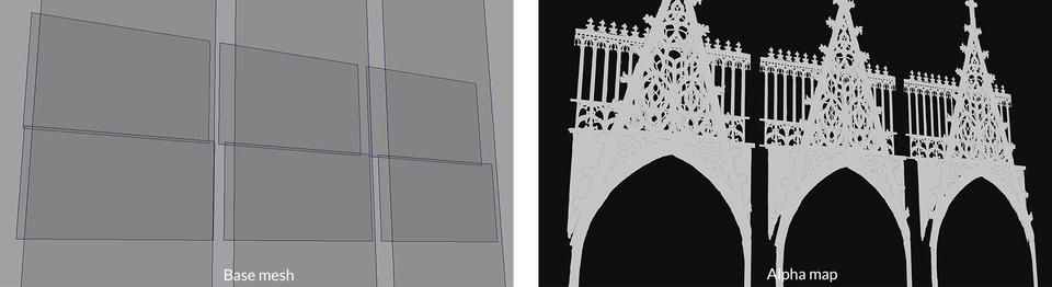 In order to reach a maximum detailed surface within a minimum render time the advantages of the Renderman REYES renderer were used to create the digital assets. The trick was to use displacement maps on very lowres base meshes that created the illusion of very fine and detailed sculptings. This technique saved al lot of modeling and rendering time.