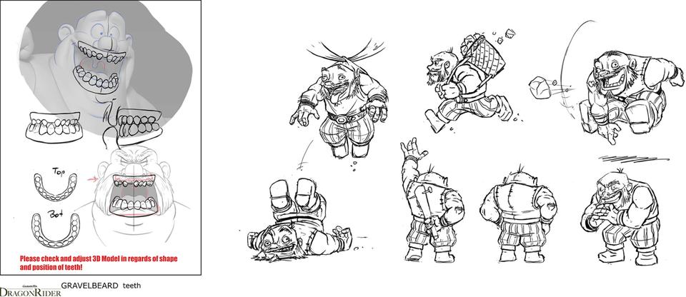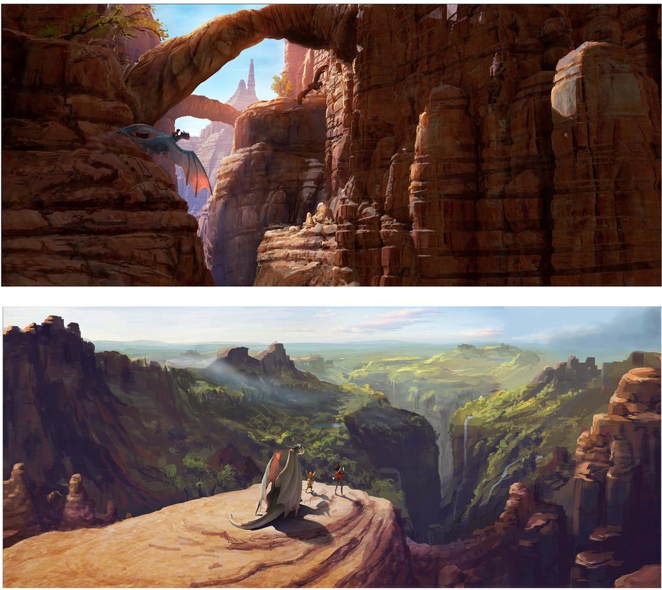 The Valley of the Dragons was challenging in many ways. On the one hand because most of the places are played here, on the other hand because it should actually be an uncomfortable place that the dragons want to leave, but there should also be scenes in the film that suggest a certain cosiness. In the book it is assumed that the valley is located in more northerly regions. Since these are mostly bare and if wooded, then only with conifers, it was especially difficult to tell the home of the brownies. Because these small, cat-like creatures build their caves in the cavities of trees, which was simply better designed with gnarled deciduous trees than with the straight, columnar trunks of the Nordic spruce. Swamps also appear in the script and so in the end the valley became a place that cannot be explicitly assigned to an existing country. The valley is most likely to be associated with British Columbia in western Canada, which has both arctic and warm temperate climates. The color spectrum of this set is dominated by cold green, turquoise and blue tones.