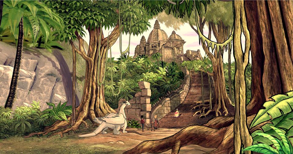After narrowly escaping the dangerous Djinn, the heroes continue their journey to India. In a bay they head for the village where the seer Subisha Gulab lives. The temple in which the story of the dragon rider is told is enthroned high up on a hill. With its vegetation, the bay is reminiscent of Kerala in the south-west of India. Conceptually, the village should look poor and improvised, but with its brightly colored colors it should set itself apart from all other sets, especially the very monochrome Himalayas set that followed. The architecture of the Dragon Rider Temple is based on the style of Hindu buildings of the 10th and 12th centuries, with its classic tower structures consisting of the slightly curved temple tower Sikhara and the underlying, separated Garbhagriha, in which the sanctuary is located.