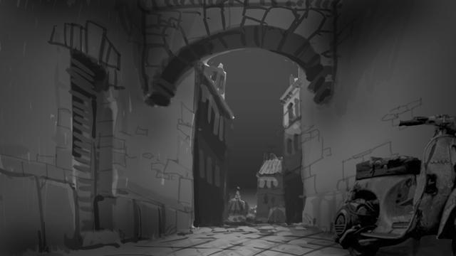 The short tells the story of Irwin (WT), a male street rat, who sings a love serenade to a dark window in a small dark ally. Unexpectedly he is being backed up by three mice friends, who show up unannounced with the intention of supporting him. Embarrassed and confused he continues singing, and eventually finishes his song with a proud bow. As he hopefully looks up to the window he realises that despite his honest love declaration no reaction was produced through his efforts. Disappointed, he turns to leave, but on the way undergoes an internal emotional crisis, unable to accept his defeat. In a desperate attempt he attempts to climb up the window and gets injured in result. After getting knocked out he slowly recovers with the aid of his loyal friends and returns to his senses, but as he attempts to leave the ally with his friends and return to the city, he realises that he is unable to go brake the force that initially brought him there.