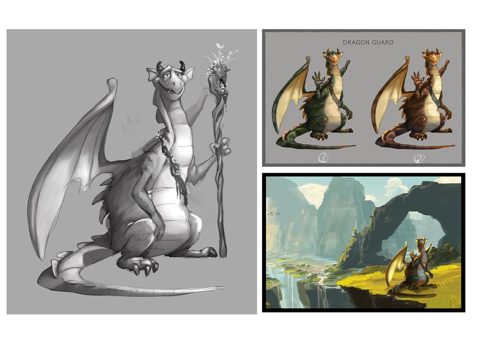The Valley of the Dragons was challenging in many ways. On the one hand because most of the places are played here, on the other hand because it should actually be an uncomfortable place that the dragons want to leave, but there should also be scenes in the film that suggest a certain cosiness. In the book it is assumed that the valley is located in more northerly regions. Since these are mostly bare and if wooded, then only with conifers, it was especially difficult to tell the home of the brownies. Because these small, cat-like creatures build their caves in the cavities of trees, which was simply better designed with gnarled deciduous trees than with the straight, columnar trunks of the Nordic spruce. Swamps also appear in the script and so in the end the valley became a place that cannot be explicitly assigned to an existing country. The valley is most likely to be associated with British Columbia in western Canada, which has both arctic and warm temperate climates. The color spectrum of this set is dominated by cold green, turquoise and blue tones.
