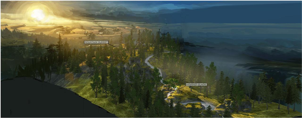 The last part of their trip takes place in the Himalayas Mountains. Stylistically, things come full circle here. The inhospitable and cold environment corresponds to the atmosphere that the Dragon Valley is supposed to suggest; rather, it seems to be even more hostile to life. Dramaturgically, a retarding moment is created here, in order to allow the audience to immerse themselves in the hopeful and fantastic landscape of the Rim of Haven after the action-packed showdown. The angular, crystal-like, almost black rock formations protrude into the sky like pointed fingers and are highlighted in contrast by the soft, cyan-blue snow banks. To escape a snow storm, our heroes take refuge in a gigantic crystal cave. The idea of telling a surreal space here once again allows the real and metaphysical world to merge further. The gate to the hall where the showdown takes place is high up on a gigantic, crater-like mountain peak. The architecture in the hall with its geometric columns composed of many small cuboids draws its analogy from the rock formations and thus looks like a part of the mountain itself; ancient and out of this world. After the magical secret exit in the hall has opened, our heroes step out and enjoy the vastness and freedom of the Rim Of Heaven. For a brief moment a place of hope is revealed to the viewer. Lush green meadows and gentle valleys; crystal-colored waterfalls and colorful flower borders; everything is embedded in a soft sea of clouds, which is supposed to protect this magical place from intruders like a gigantic barrier.