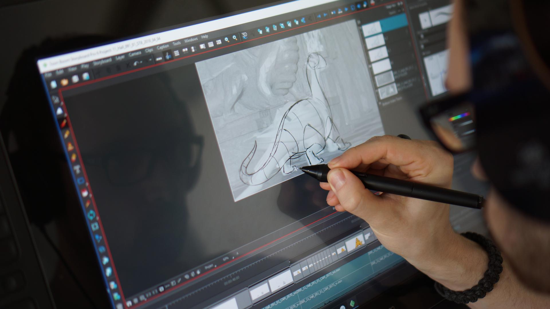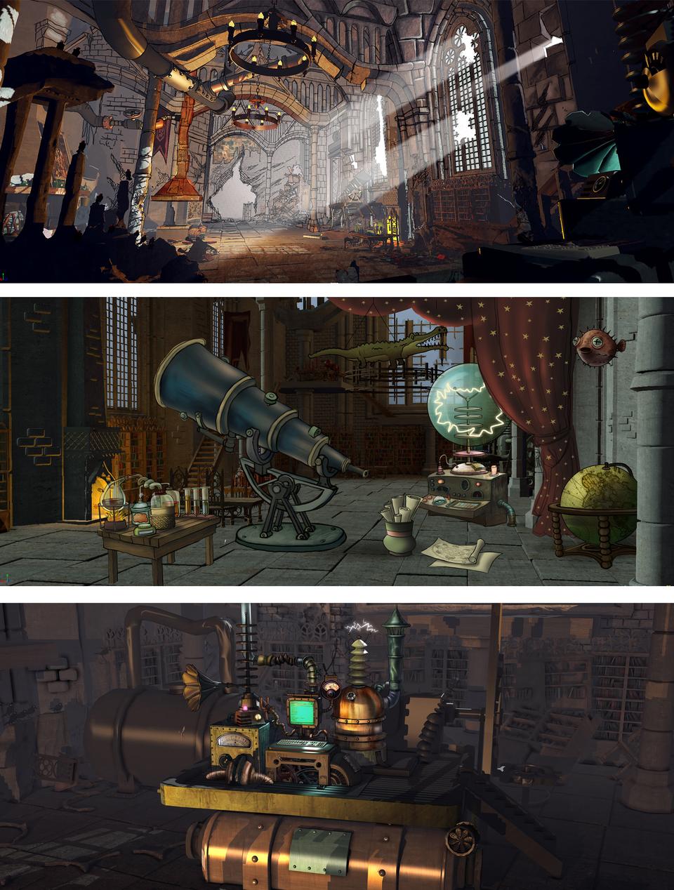 The creative goal regarding the production design was to hit the right balance between stylized and detailed designs. In order to minimize the discrepancy between stylized characters and photo-realistic set elements, the large shapes that define the space of the set were reduced to a simple, recognizable form. On the other hand, the colors in the final color script were overdrawn for each individual set from the start in order to rule out an uncanny valley effect.