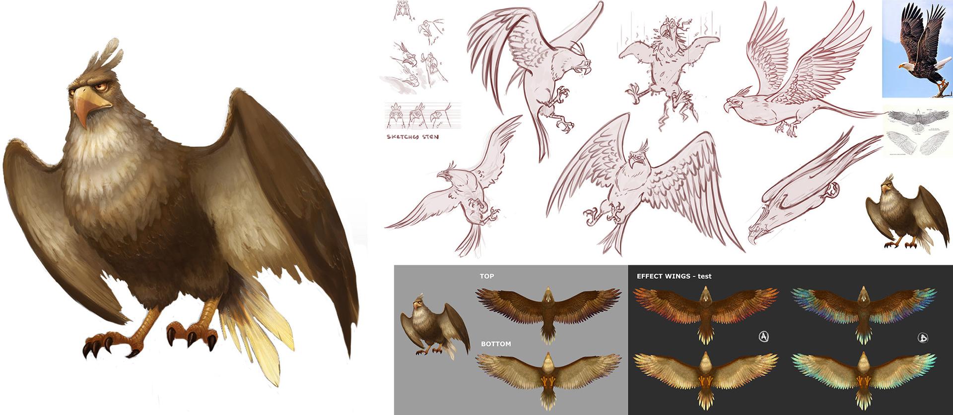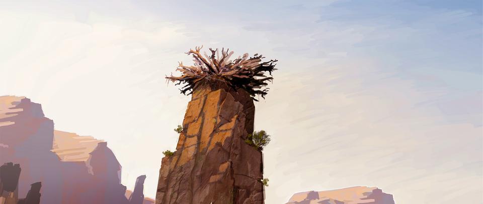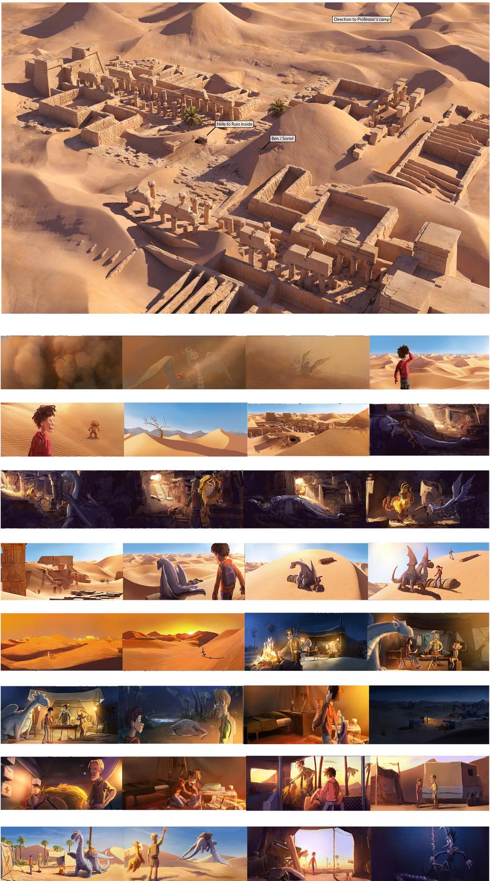 After the arduous odyssey through world history, our heroes land on a barren stretch of coast. Here Sorrel is kidnapped by a huge bird of prey and an action-packed chase begins. Right from the start, the set was designed as a kind of natural obstacle course. Since the bird of prey is reminiscent of a giant bald eagle, the decision to design the set in the style of the Grand Canyon in Arizona was only an obvious one. The challenge for the layout artists was to design the chase in such a way that the viewer gets the feeling of flying higher and higher until Sorrel plunges into the depths at the highest point to be rescued by Firedrake just above the bottom. For this purpose, a library of modular layout geometries of the rock formations was built, which could be moved as desired. The reddish-brown rock formations stand in stark contrast to the colors of the following set.